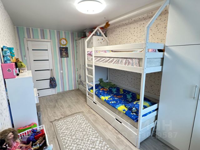 В стильной и комфортной спальне находится большая кровать с ортопедическим матрасом средней жесткости, который застелен постельным бельем и мягким покрывалом и разложены декоративные подушки. Вместительные шкафы и оригинальные прикроватные тумбочки выполнены в едином гарнитуре. Предусмотрены розетки по разным стенам, в том числе и для ТВ. На окне качественные портьеры блэкаут и современная вуаль на скрытом потолочном карнизе, идеально сочетающиеся со стильными обоями.