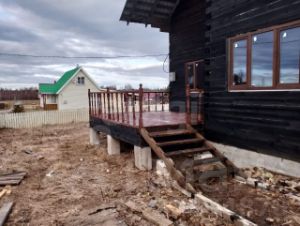 Площадка перед домом, дорожки у дома и площадка у бани и дровеника выложены плиткой. В дом 2 входа, с веранды и центральный вход.