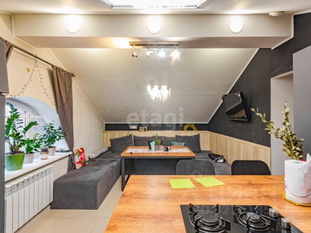 Кухня-гостиная позволит разместиться всей семье и пригласить гостей. Установлен кухонный гарнитур современного дизайна с варочной панелью и духовым шкафом, встроенным холодильником и вытяжкой, каменной мойкой и смесителем, качественными петлями с доводчиками на фасадах и направляющими так же с доводчиками на выкатных ящиках. Обеденный стол сервирован чайным набором и окружен удобными мягкими креслами, современный раскладной диван с декоративными подушками. Предусмотрены розетки по разным стенам, в том числе и для ТВ. На окне повешены портьеры с красивым рисунком и вуаль, на скрытом потолочном карнизе, гармонично подходят по цвету и фактуре к обоям.