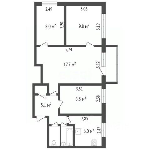 Общая площадь этой 1-комнатной квартиры равнозначна 3-комнатной "хрущевке" 49.2 кв метра.
