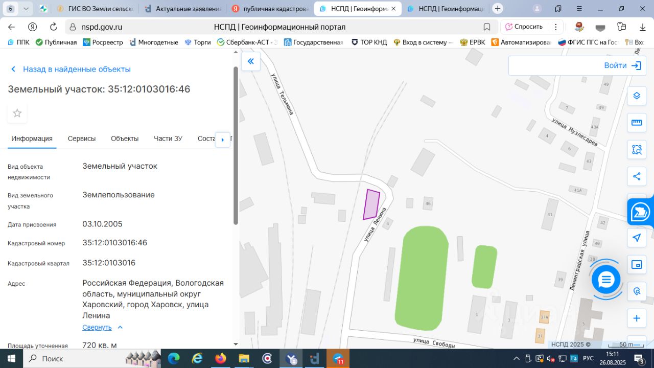 Земельный участок с кадастровым номером 35:12:0103016:46, площадью 720 кв.м, категория земель - земли населенных пунктов, разрешенное использование: бытовое обслуживание, местоположение: Российская Федерация, Вологодская область, муниципальный округ Харовский, г. Харовск, ул. Ленина