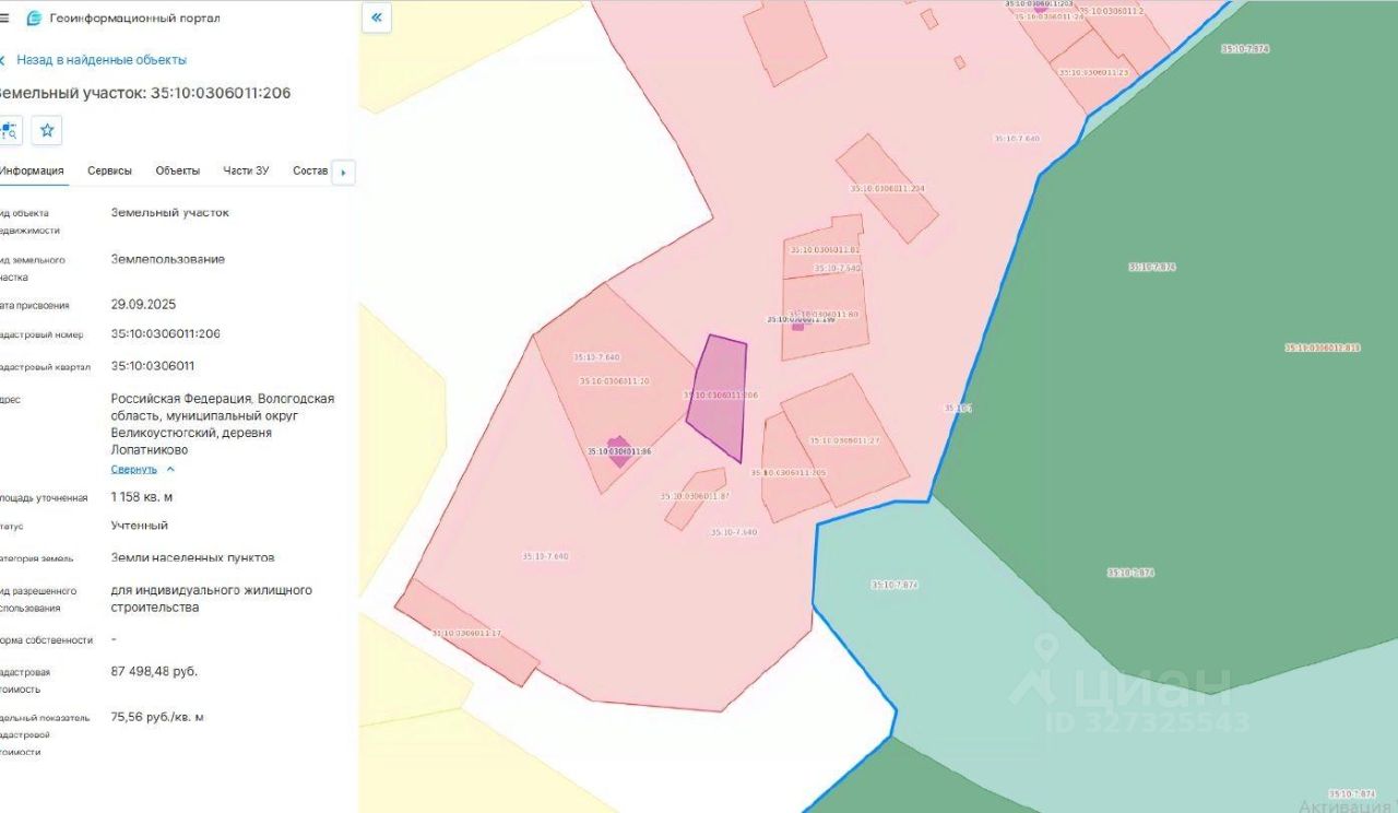 Земельный участок с кадастровым номером 35:10:0306011:206, площадью 1158 кв. м, категория земель - земли населенных пунктов, разрешенное использование: для индивидуального жилищного строительства, местоположение Российская Федерация, Вологодская область, муниципальный округ Великоустюгский, деревня Лопатниково