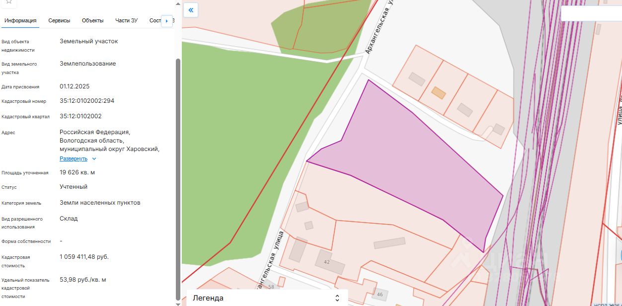 Земельный участок с кадастровым номером 35:12:0102002:294, площадью 19626 кв. м, категория земель - земли населенных пунктов, разрешенное использование: склад, местоположение: Российская Федерация, Вологодская область, муниципальный округ Харовский, город Харовск, улица Архангельская.