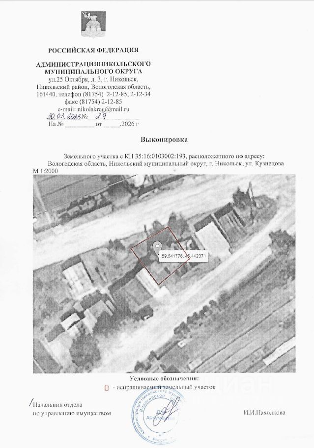 Земельный участок с кадастровым номером 35:16:0103002:193, площадью 75 кв.м, категория земель - земли населенных пунктов, разрешенное использование: хранение автотранспорта, местоположение: Российская Федерация, Вологодская область, муниципальный округ Никольский, город Никольск, улица Кузнецова.