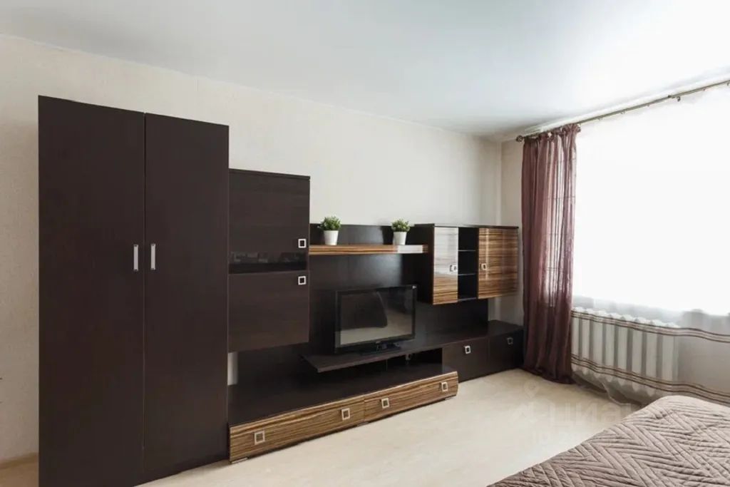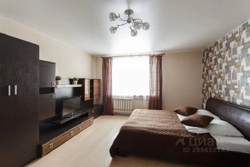 Эта квартира предлагает комфортное размещение с современным интерьером. Просторная спальня с большой двуспальной кроватью оформлена в теплых коричневых тонах, что создает атмосферу уюта и спокойствия. В зоне отдыха располагается удобный диван и журнальный столик, что позволяет расслабиться после насыщенного дня. На стенах интересные обои с городскими мотивами, добавляющие динамики в пространство. В гостиной предусмотрены телевизор и вместительный шкаф для хранения вещей.
