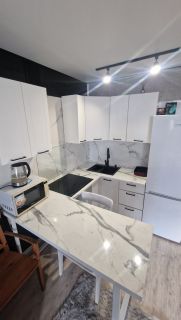 В квартире есть все необходимое для удобного проживания: современный евроремонт, встроенная мебель и вся необходимая техника, включая кондиционер, холодильник, телевизор и стиральную машину. Ванная комната оборудована ванной, что добавляет комфорта. Из студии есть выход на балкон, где можно наслаждаться свежим воздухом и видом на город.