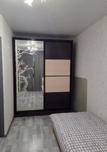 В комнате: одноместная кровать, большой шифоньер для одежды и других вещей, рабочий стол и полки.