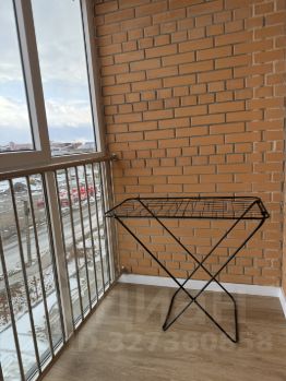 На балконе установлена напольная сушилка для белья. Панорамные тонированные окна.