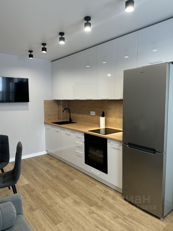 Кухонный гарнитур МДФ с доводчиками, оснащен большой мойкой на 50 см, посудомоечной машиной, духовым шкафом, варочная панель индукция , встраиваемая вытяжка с подсветкой и большой двухкамерный холодильник. Так же имеется микроволновая печь и электрический чайник. Посуда, бокалы и вилки на 4 персоны.