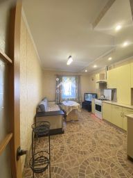 Квартира находится на первом этаже двухэтажного дома, а её окна выходят на улицу. Общая площадь квартиры составляет 46 квадратных метров, из которых 18 квадратных метров занимает кухня. Высота потолков — три метра, что создаёт ощущение простора и свободы. В квартире выполнен косметический ремонт, поэтому вы сможете сразу заселиться и наслаждаться комфортом, так же есть все необходимое для комфортной жизни: мебель, техника.
