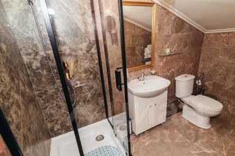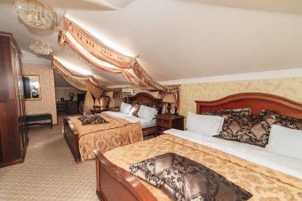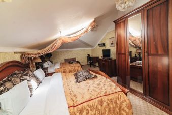 Номер расположен в мансардном этаже, что не создает неудобств гостям, а предполагает особую тишину в номере и необычный дизайн окон. Номер оформлен в элегантных пастельных тонах и оборудован всем необходимым для того, чтобы гости могли почувствовать себя комфортно в нашем отеле. Номер оснащен двумя кроватями размера king-size и одной односпальной кроватью. В номере удобно проживать, как семьям с детьми, так и друзьям или сотрудникам компаний. Современная удобная мебель в номере создает идеальные условия для работы и отдыха. В номере предусмотрена ванная комната, оборудованная душевой кабиной, имеется фен, тапочки, косметические и туалетные принадлежности. По запросу гостям предоставляется в номер электрический чайник с чайными принадлежностями. Номер рассчитан на размещение 5 человек. Смена постельного белья в заселенных номерах производится раз в 2 дня, а полотенец производится ежедневно. Проживание детей до 1 года бесплатно без предоставления дополнительного места, от 1 года до 6 лет -450 руб., с 6-ти лет - 1000 руб.