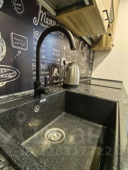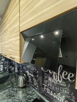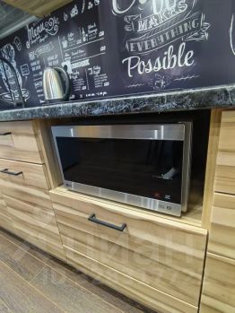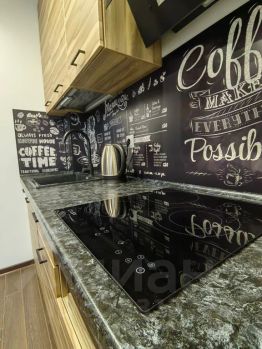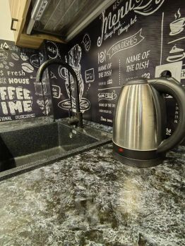 Кухня, оборудованная индукционной плитой, новым холодильником, электрическим чайником, микроволновкой, набором посуды.