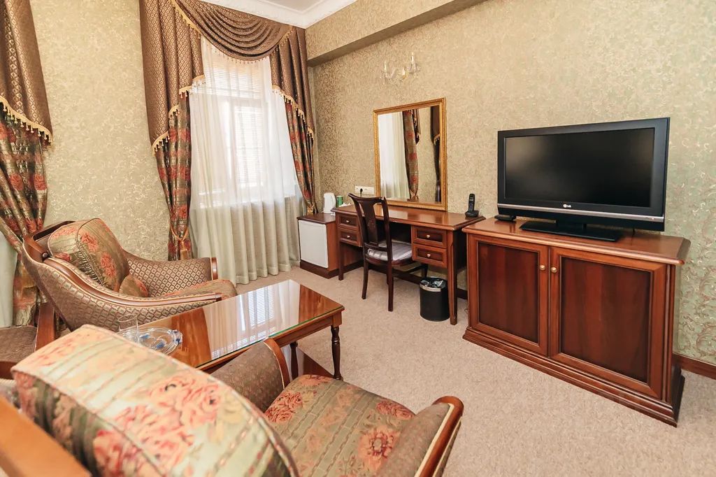 В номерах есть мини-бар(продукция оплачивается отдельно), чайные принадлежности, электрический чайник, чай, кофе, бутылка питьевой воды. Смена постельного белья в заселённых номерах производится раз в 2 дня, а полотенец производится ежедневно.