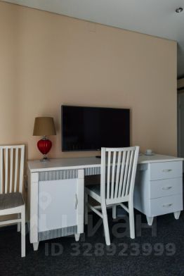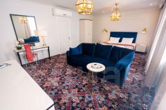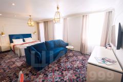 В номере двуспальная кровать, диван, стол, телевизор, ванная комната.