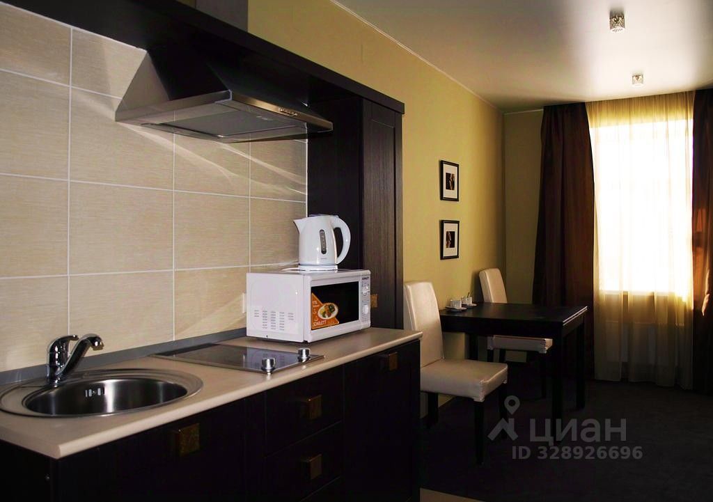 В номере двуспальная кровать, телевизор, ванная комната. Кухонный уголок оборудован микроволновой печью, чайником, посудой.