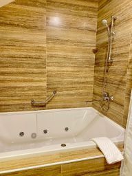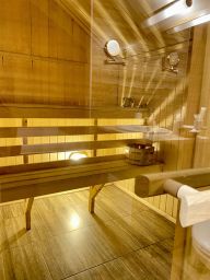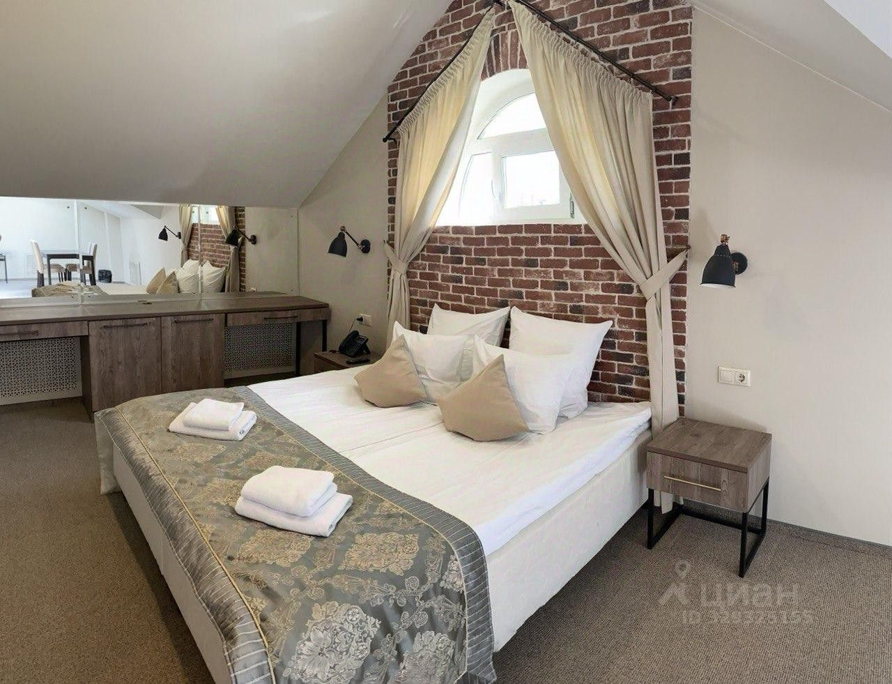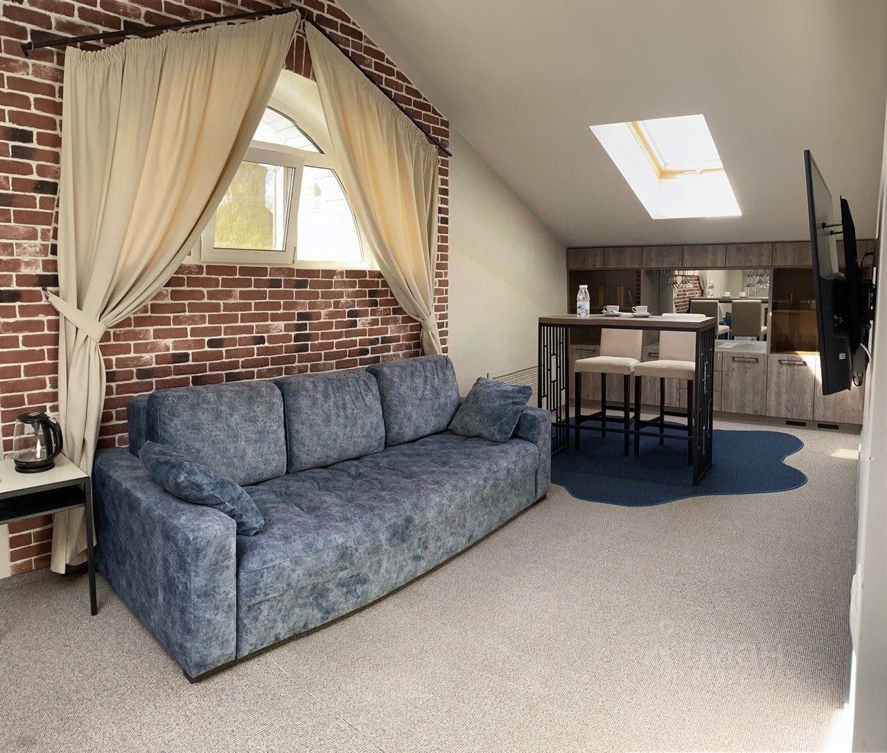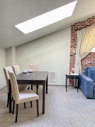 Номер расположен в корпусе 2 по адресу: Благовещенская 51б на третьем этаже,в номере присутствуют мансардные окна.Просторный номер с отдельной зоной сна и отдыха.В номере есть двуспальная кровать, диван, два жк-тв,обеденный стол,барная стойка, холодильная камера,электрический чайник,халаты,тапочки.Гардеробная комната.Просторная ванная комната с джакузи и выходом в финскую сауну.