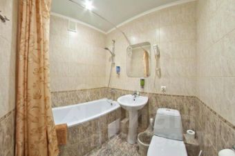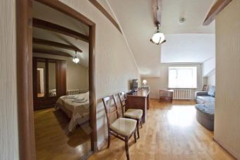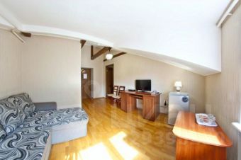В комнатах: в одной комнате двуспальная кровать, во второй угловой диван, два LCD телевизора, спутниковое тв, письменный стол, шкаф, ванная комната, фен.
