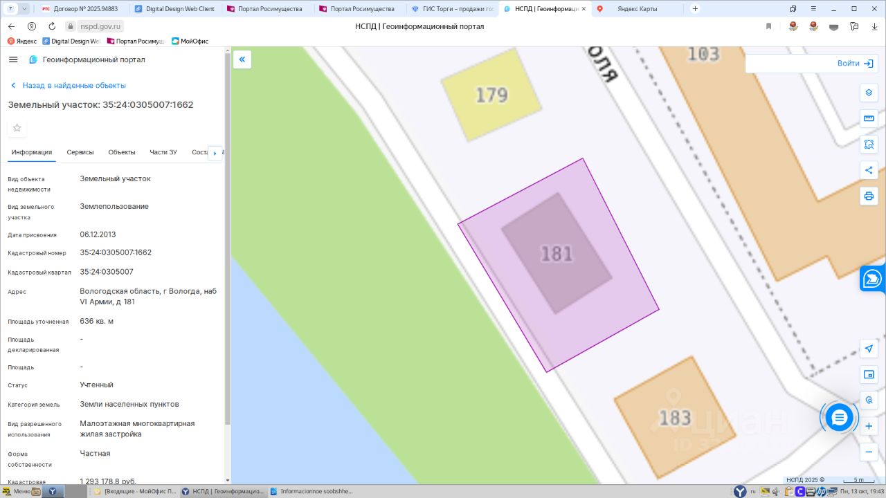 Земельный участок ,площадью 636 кв.м., кадастровый номер 35:24:0305007:1662, расположенный по адресу: Вологодская область, г. Вологда, ул. наб. 6 Армии, д.181 1 Штука (шт)