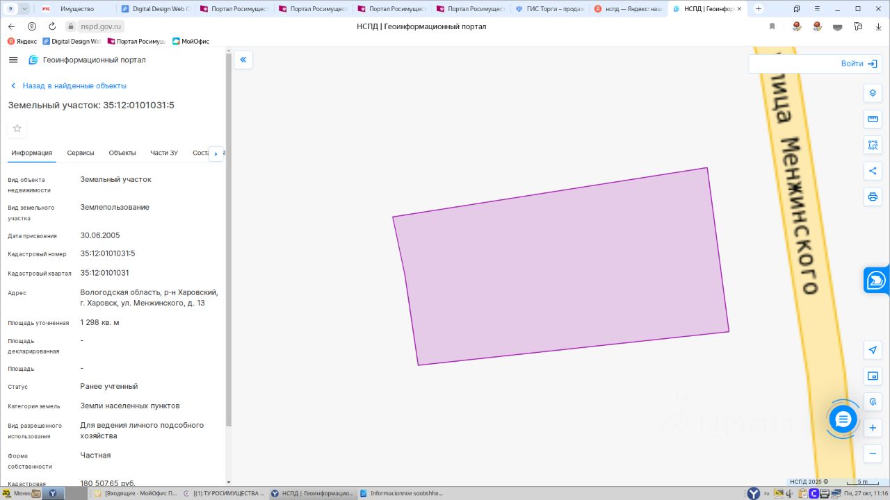 Земельный участок, площадью 1298 кв.м., кадастровый номер 35:12:0101031:5, расположенный по адресу: Вологодская область, Харовский район, г. Харовск, ул. Менжинского, д.13 1 Штука (шт)