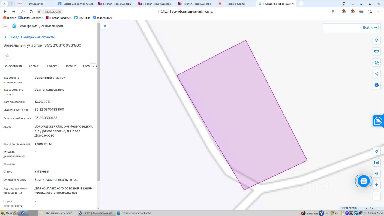 Земельный участок, площадью 1895 кв.м., кадастровый номер 35:22:0310033:860, расположенный по адресу: Вологодская область, Череповецкий район, с/с Домозеровский, д. Новое Домозерово 1 Штука (шт)