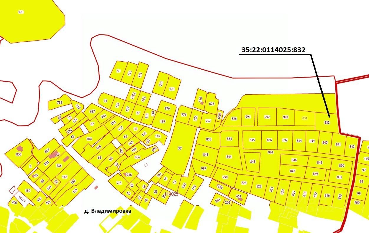 Земельный участок с кадастровым номером 35:22:0114025:832 площадью 1970 кв. м, категория земель - земли населенных пунктов, разрешенное использование: малоэтажная жилая застройка (индивидуальное жилищное строительство, размещение дачных домов и садовых домов), местоположение: Российская Федерация, Вологодская область, Череповецкий район, Судский с/с, д. Владимировка.