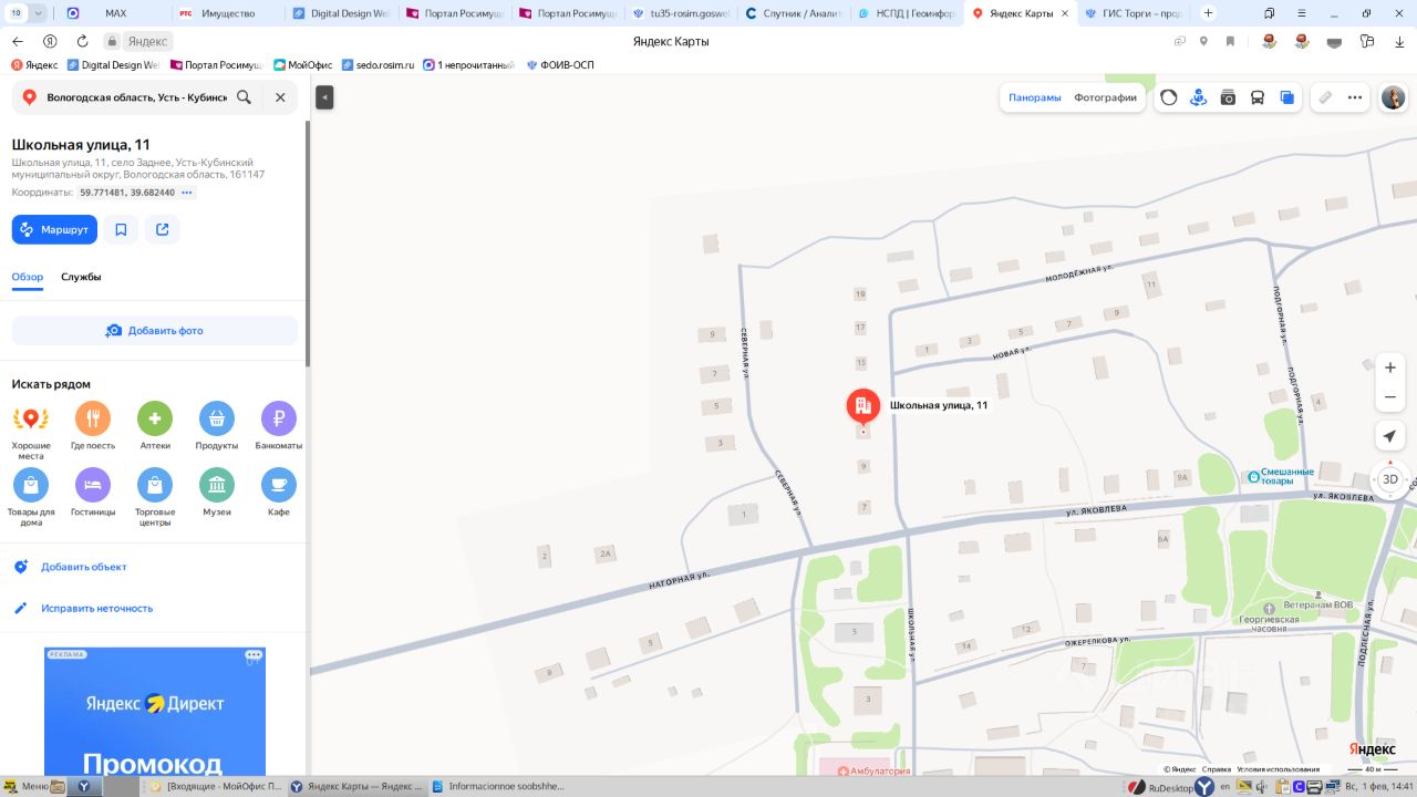 Здание, площадью 86,2 кв.м., кадастровый номер 35:11:0206010:282, земельный участок, площадью 900 кв.м., кадастровый номер 35:11:0206010:16, расположенные по адресу: Вологодская область, Усть - Кубинский район, с. Заднее, ул. Школьная, д.11 1 Штука (шт)