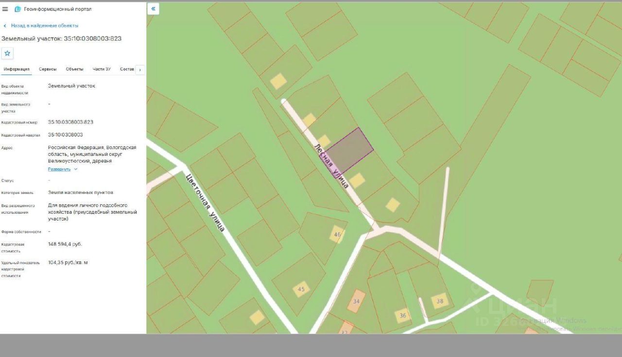 Земельный участок с кадастровым номером 35:10:0308003:823, площадью 1424 кв. м, категория земель - земли населенных пунктов, разрешенное использование: для ведения личного подсобного хозяйства (приусадебный земельный участок), местоположение: Российская Федерация, Вологодская область, муниципальный округ Великоустюгский, деревня Золотавцево.