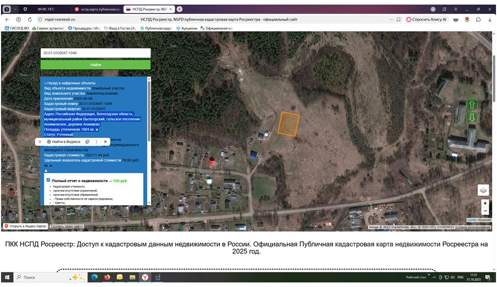 Земельный участок с кадастровым номером 35:01:0103047:1048, площадью 1924 кв. м, категория земель - земли населенных пунктов, разрешенное использование: для индивидуального жилищного строительства, местоположение: Российская Федерация, Вологодская область, муниципальный район Вытегорский, сельское поселение Анхимовское, деревня Анхимово