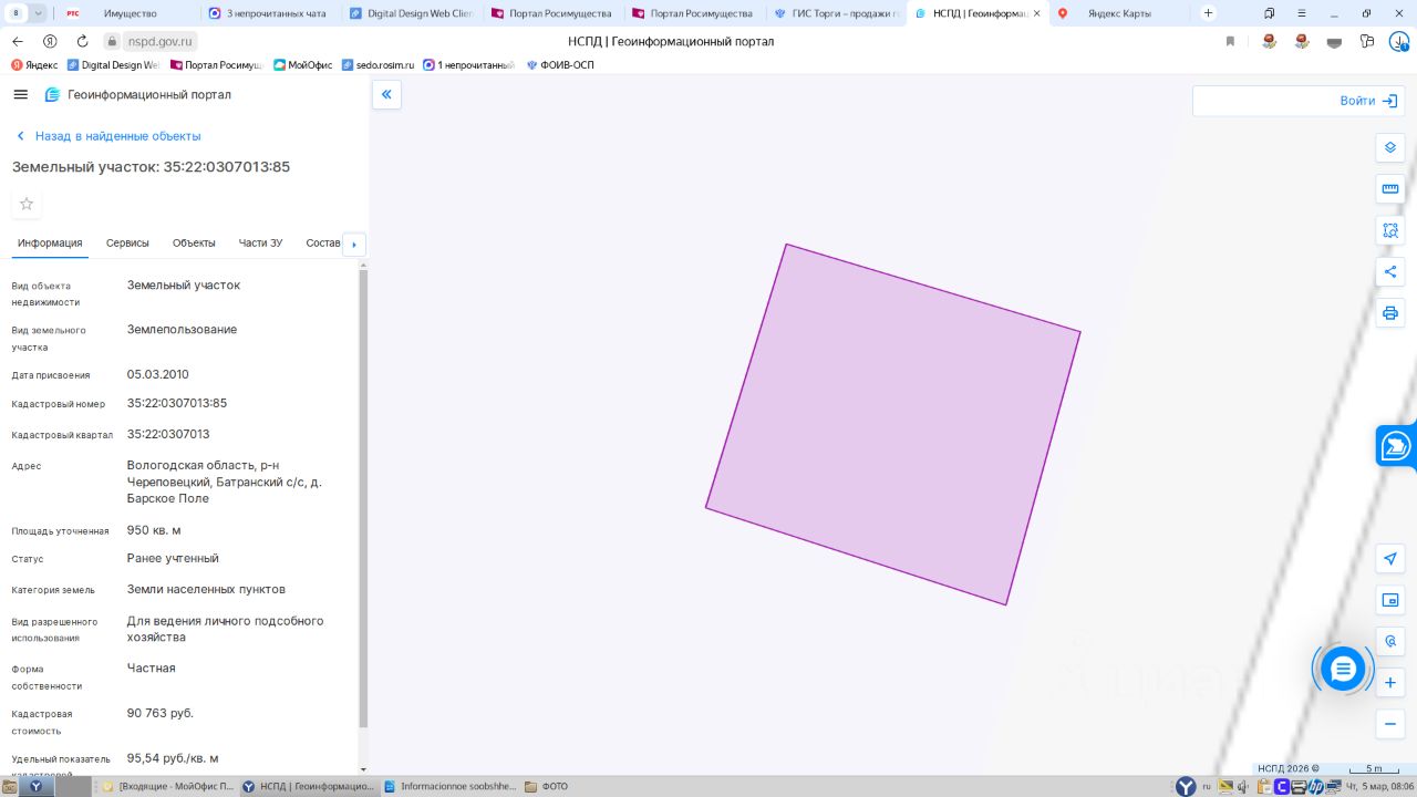 Земельный участок, площадью 950 кв.м., кадастровый номер 35:22:0307013:85, расположенный по адресу: Вологодская область, Череповецкий район, Батранский с/с, д. Барское Поле 1 Штука (шт)