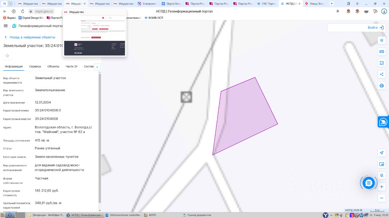 Земельный участок, площадью 415 кв.м., кадастровый номер 35:24:0104008:3, расположенный по адресу: Вологодская область, г. Вологда, с/тов. Майский, участок 82а 1 Штука (шт)
