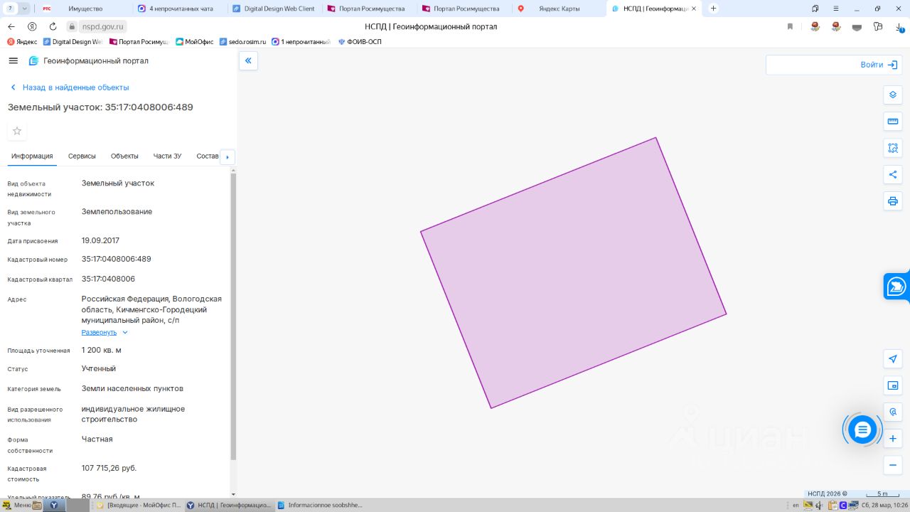 Земельный участок площадью 1200 кв. м, расположенный по адресу: Вологодская обл, Кичменгско-Городецкий муниципальный район, с/п Городецкое, д. Раменье, ул. Ягодная, д. 13, кадастровый номер 35:17:0408006:489 1 Штука (шт)