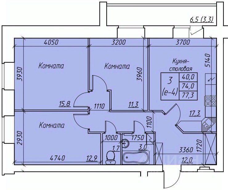 3-комн. квартира, 77,3 м²
