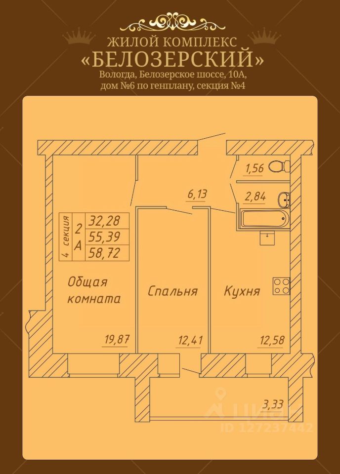 Продаётся 2-комнатная квартира в строящемся доме (Дом 6), срок сдачи: II-кв. 2026, общей площадью 58.72 кв.м., на 4 этаже. Расположение, транспортная доступность