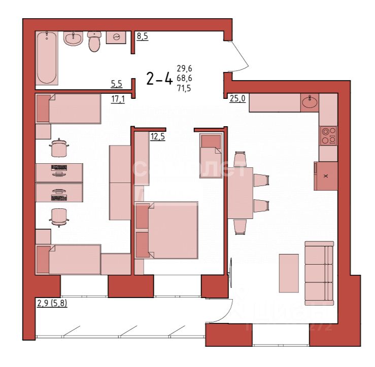 Арт. 105947110 В продаже двухкомнатная квартира евро-планировки с большой кухней-гостиной в нoвом доме!