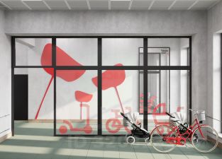 Двор на уровне второго этажа — благоустроенная приватная терраса с игровыми зонами и местами для прогулок жителей.