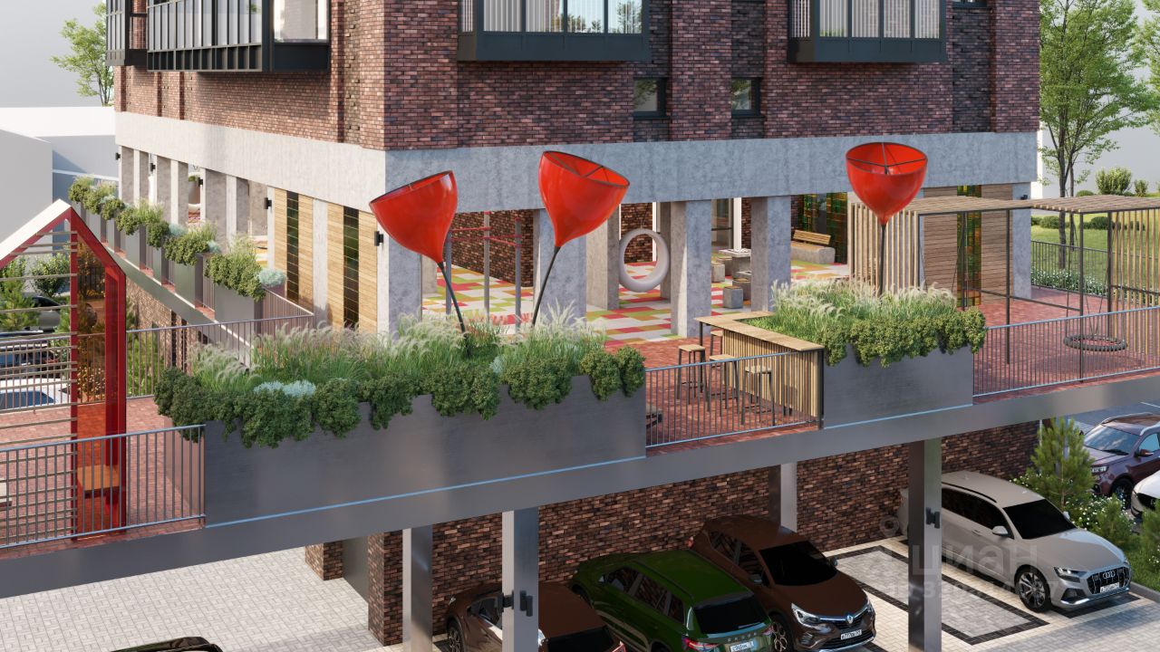 Это 16-этажный дом на улице Кирпичной с гаражами на первом уровне и приватным двором на втором.