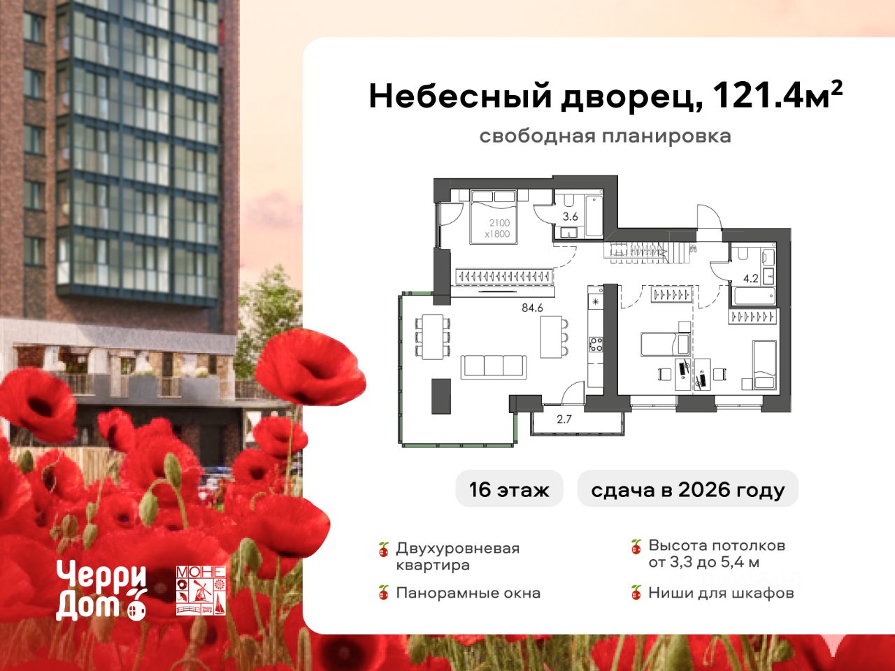 4-комнатная квартира площадью 121 м² в жилом комплексе "Моне" от застройщика ЧерриДом.
