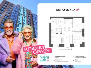 Квартира на 10 этаже, общей площадью 71.7 м². Высота потолков — 2,7 м. Квартира с предчистовой отделкой.