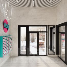 Вертикальные полосы цвета Tiffany на фасаде, дизайнерская навигация, арт-объекты — дом, мимо которого не пройдёшь. Во дворе — граффити с Одри Хепберн и Голова Зевса в розовых очках. Подъезды оформлены студией CherryDesign — сюда приятно возвращаться каждый вечер.