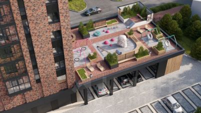 Закрытая территория на уровне второго этажа. Клубника, малина, хвойные растения, игровые зоны, уютные места для отдыха. Машины остаются внизу — наверху только зелень, тишина и безопасность.