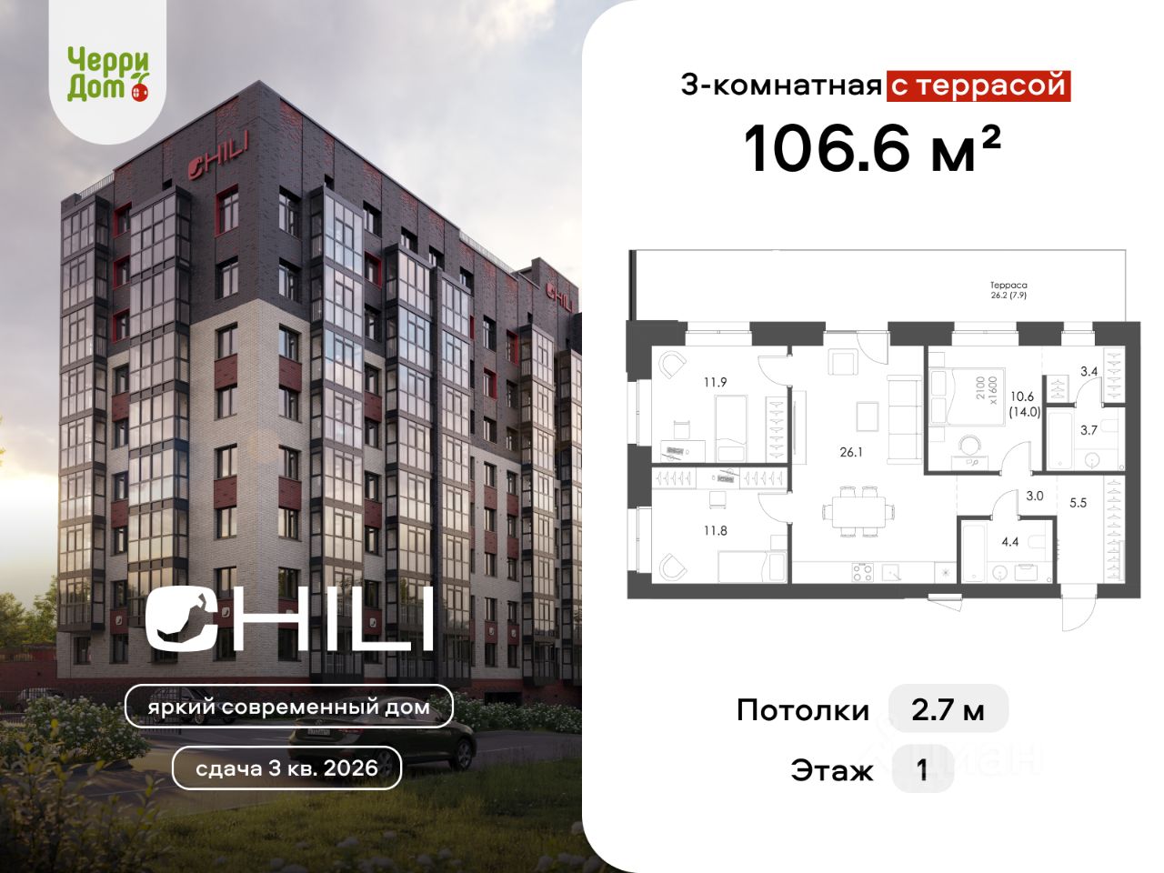 Продаётся 3-комнатная квартира 5 в жилом комплексе Чили от застройщика ЧерриДом.