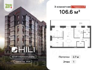 Квартира на 1 этаже, общей площадью 106.6 м². Высота потолков — 2,7 м. Предчистовая отделка.