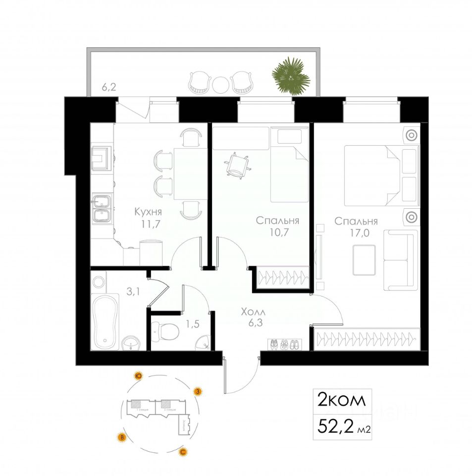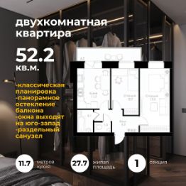 2-комнатная квартира площадью 52,2 м² с современной планировкой: