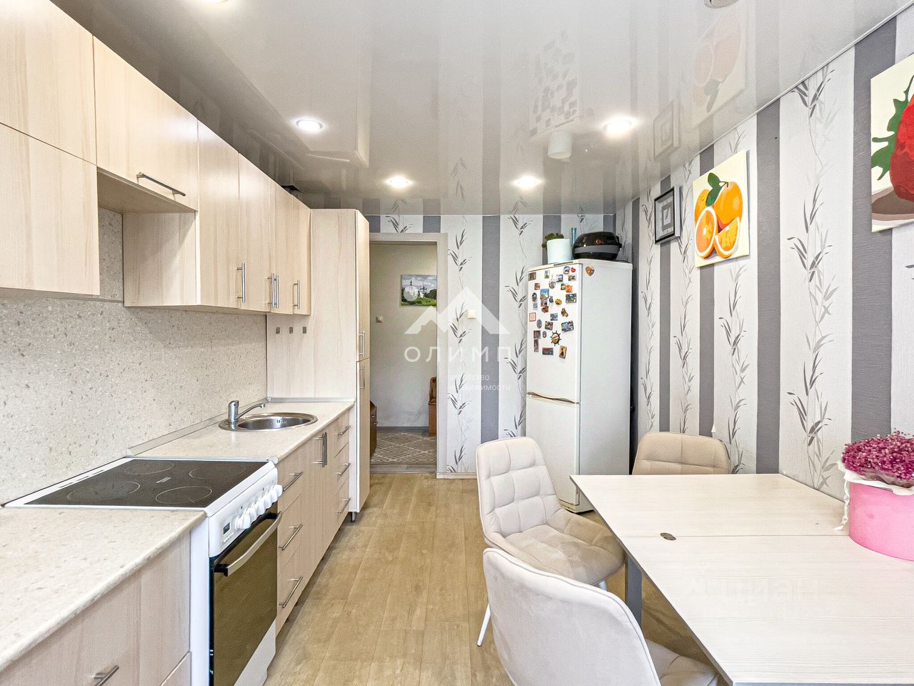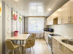 Окна пластиковые стеклопакеты, на стенах обои, на полу линолеум, натяжные потолки. Хорошая новая входная дверь.