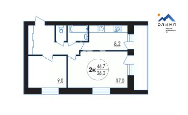 Квартира расположена на первом этаже двухэтажного кирпичного дома 1986 года постройки. Общая площадь составляет 46,7 кв. м, из которых 26 кв. м — жилая площадь. Две изолированные комнаты с окнами, выходящими на улицу, обеспечат достаточное количество естественного света и свежего воздуха. Высота потолков 2,5 м создаёт ощущение простора.