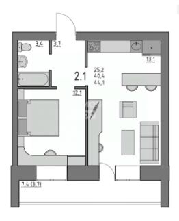 Евро 2-х комнатная квартира площaдью 44.1м2