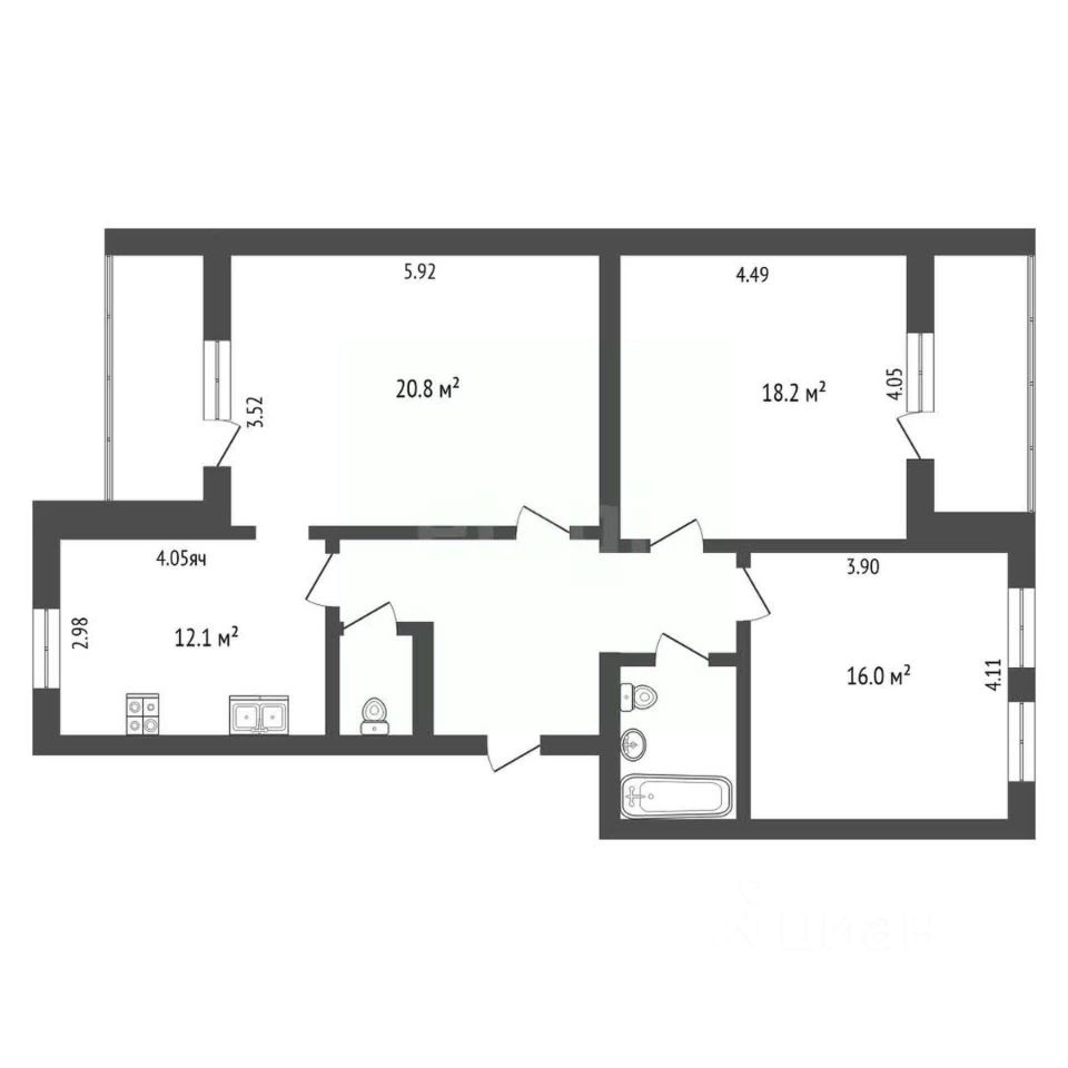 Квартира включает три изолированные комнаты (20.8, 18.2 и 16 кв. м), а также подсобное помещение, которое можно переоборудовать под второй санузел или гардеробную — идеальное решение для хранения вещей.