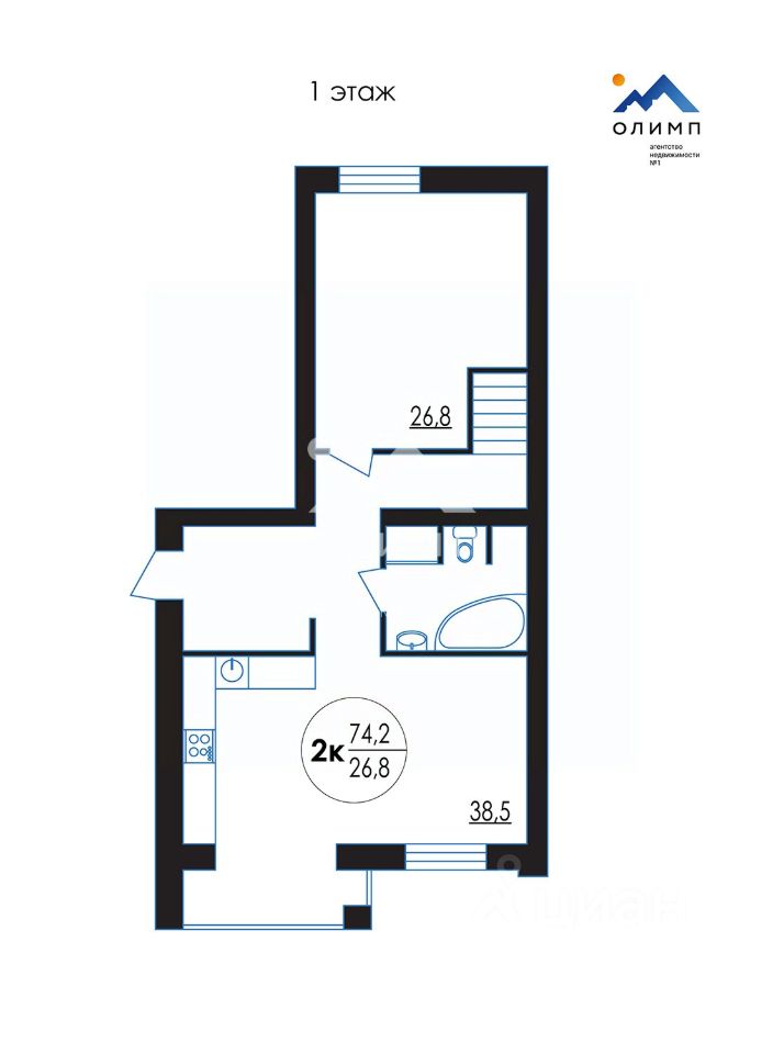 На первом этаже квартиры 74.2 кв.м., в которые входят: