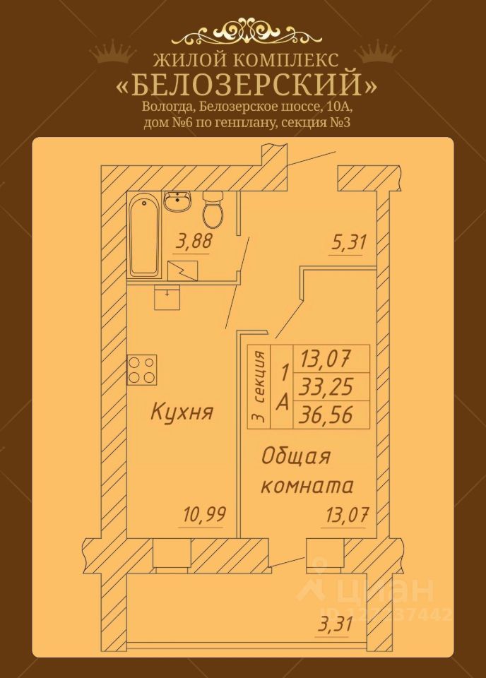 Продаётся 1-комнатная квартира в строящемся доме (Дом 6), срок сдачи: II-кв. 2026, общей площадью 36.56 кв.м., на 9 этаже. Расположение, транспортная доступность