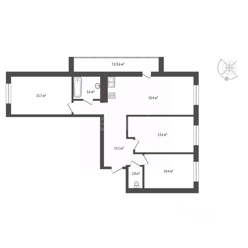 Квартира семейной планировки - 3 спальни, кухня-гостиная, раздельный санузел (очень важно для семьи с детьми)